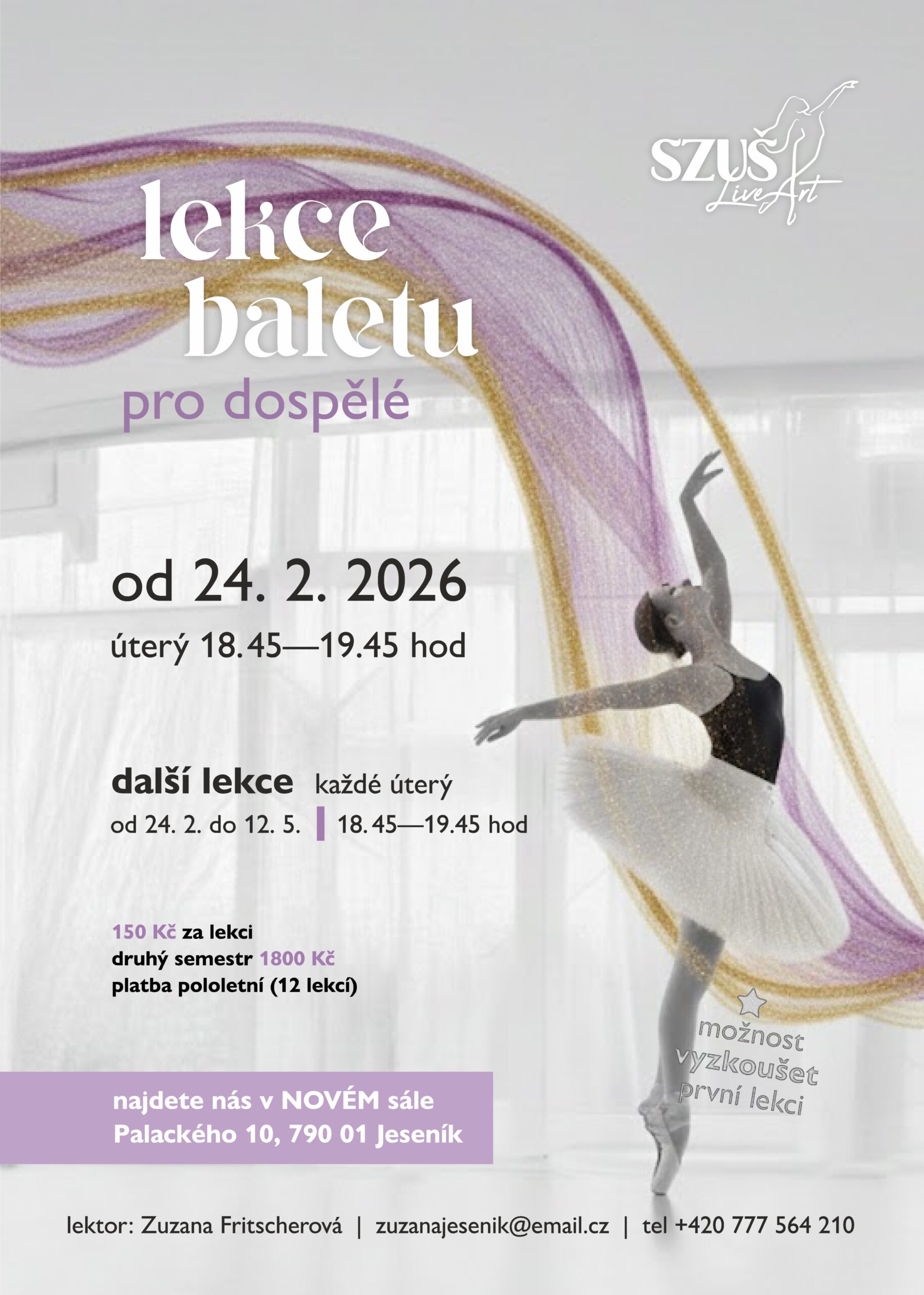 Na lekcích si postupně projdete základy klasické taneční techniky. Naučíte se taneční pozice a prvky u baletní tyče, a také v prostoru, budete pracovat se základními variantami pohybů a tanečních variací. Lekce jsou proto vhodné i pro úplné začátečníky, kteří s tancem a klasickou taneční technikou nemají vůbec žádné zkušenosti.