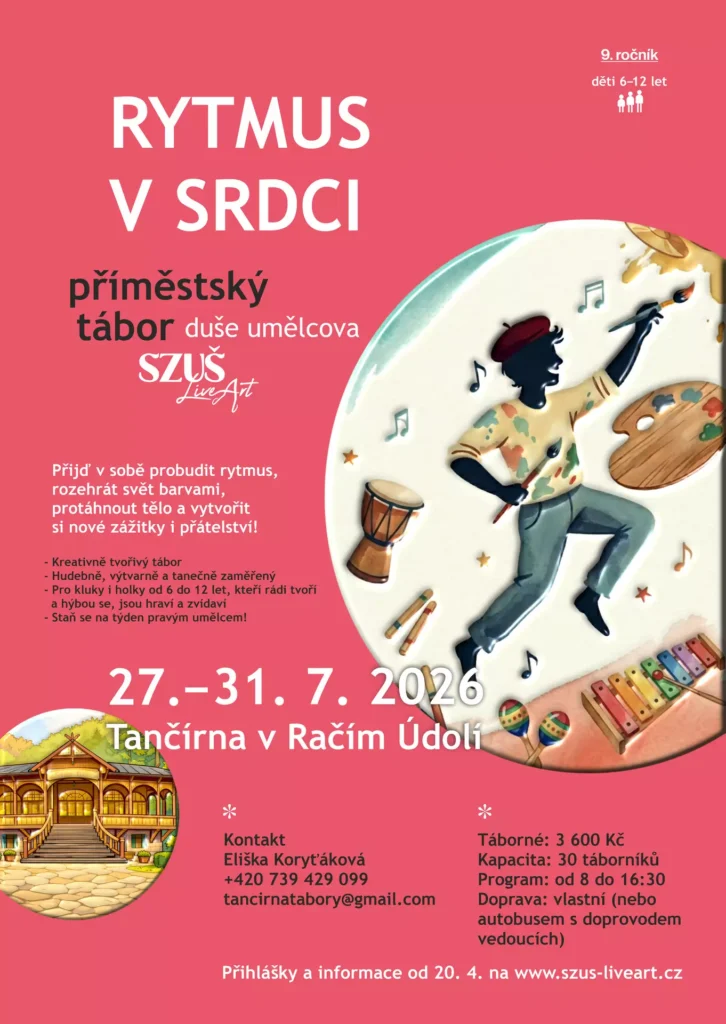 Staň se na týden pravým umělcem! Přijď v sobě probudit rytmus, rozehrát svět barvami, protáhnout tělo a vytvořit si nové zážitky i přátelství. Propojíme různé druhy umění (hudbu, tanec, divadlo, výtvarno), zjistíme, jak tvořili jiní umělci, zkusíme kreativně myslet, hrát si, najít radost v nových dovednostech, a přitom objevíme třeba i nový kus sebe.